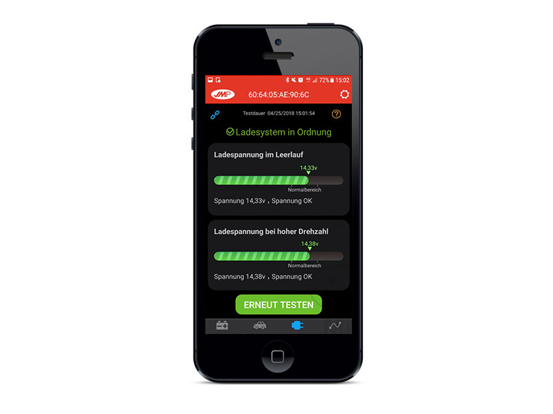 JMP Battery Monitor II Monitorovanie batérie pomocou smartfónuS JMP Battery Monitor II a novou a bezplatnou aplikáciou Apple alebo AndroidJMP BatteryMonitor II môžete rýchlo a jednoducho skontrolovať stav nabitia batérie. Plnú kapacitu a použiteľnosť možno zaručené, ak má batéria konštantný kladný stav nabitia.Pozitívny stav nabitia tiež zabraňuje akémukoľvek predčasnému poškodeniu alebo zlyhaniu batérie.Nepretržité nahrávanie umožňuje zaznamenávať stav nabitia batérie počas jázd a možno ho aj tzv. až neskôr. Súbor s údajmi je možné odoslať e-mailom zo smartfónu a zobraziť v Exceli, takže rýchlo uvidíte, kde kleslo alebo bolo príliš vysoké nabíjacie napätie Nad ním sa dá rýchlo zistiť chybný regulátor. novú aplikáciu je možné použiť aj na kontrolu štartovacích procesov (štartér, káblové pripojenia atď.) a nabíjacích procesov (alternátor, kábel atď.). To šetrí čas pri odstraňovaní problémov. V prípade slabej batérie alebo iných problémov môže byť upozorniť vodiča v závislosti od nastavenia v možnostiach aplikácie.Po jednoduchom pripojení k batérii pomocou krúžkových očiek a stiahnutí novej aplikácie pre Android alebo Apple je možné vyvolať aktuálnu hodnotu napätia.Vysielač je možné použiť pre 6V a 12V batérie. Dosah je cca. 10 metrov. Pripojenie prebieha cez Bluetooth. (Len z Bluetooth 4.0 napr. z iPhone 4s, iPad3 alebo iPod Touch 5) Upozornenie: Pre nový JMP BatteryMonitor II je potrebná nová aplikácia „JMP BatteryMonitor II“! Možnosť monitorovania 6 a 12 voltov Jednoduché pripevnenie na batériu pomocou krúžkových očiek Spotreba prúdu len cca. 2 mA Pri prepólovaní nedochádza k poškodeniu vysielača ani batérie Stiahnite si bezplatnú aplikáciu z Apple App Store alebo Google Play Store pod JMP Battery Monitor II záznam napätia aj počas jazdy. Výsledok je možné poslať emailom. Možnosť zobrazenia súboru v Exceli. Poznámka: Smartfón alebo tablet nie sú súčasťou dodávky. Obrázok slúži len na demonštráciu softvéru!