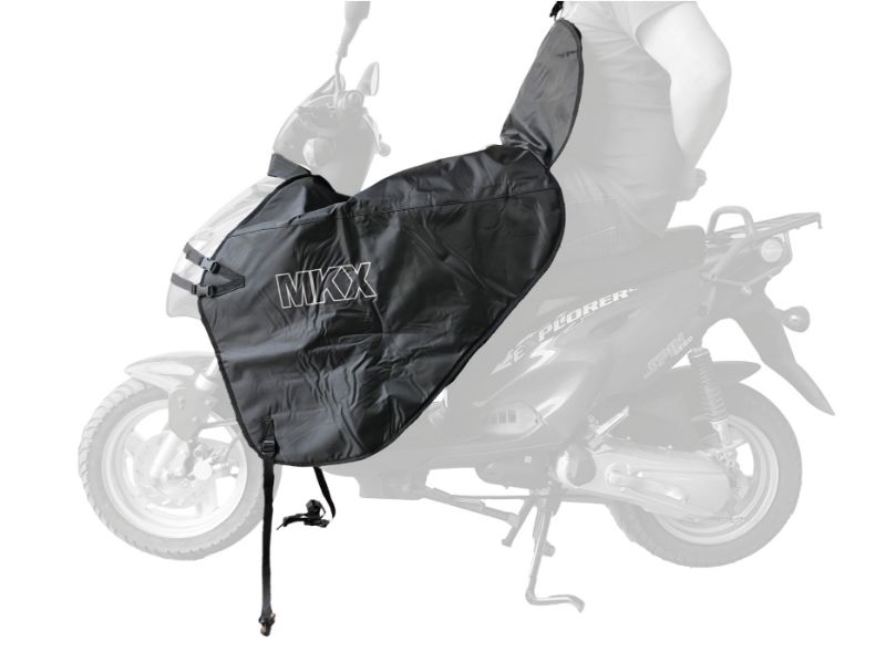 Útulný čierny návlek na nohy do chladného počasia. Tento poťah do chladného počasia je pripevnený k prednej časti skútra a chráni nohy a nohavice pred vetrom a vlhkosťou. Vode a vetru odolný predný poťah je vyrobený z pevnej 20D oxfordovej tkaniny a bavlny s reflexnými pruhmi na vonkajšej strane a silnou plyšovou vrstvou vnútri. Pomocou kombinácie nastaviteľných upevňovacích popruhov a suchého zipsu je možné sukňu univerzálne pripevniť na skútre alebo mopedy od rôznych výrobcov. Konštrukcia má samostatný prístup pre zámok zapaľovania, ktorý sa uzatvára pomocou suchého zipsu.