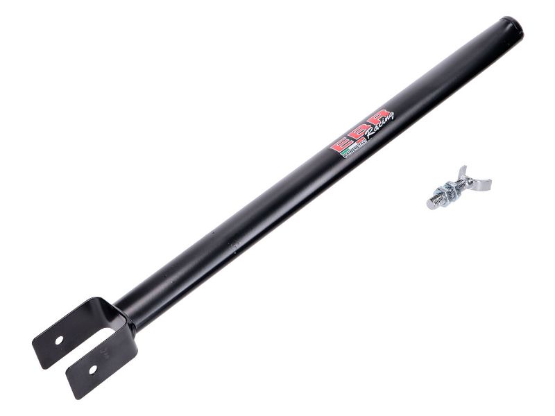 Black painted frame brace with oval tube from EBR suitable for Puch Maxi S / N and Peugeot 103 mopeds.The frame reinforcement strut is especially recomm ended for tuned engines to prevent bending due to the increased force.Dimensions:Adjustable mounting hole: approx 56 - 59cmInternal dimension of the mounting: 47mm Cross section strut: 40x20mm