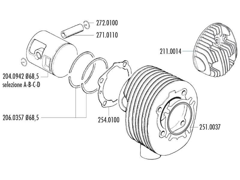 Súprava 210 ccm špičkového hliníkového pretekárskeho valca od Polini pre 200 ccm Vespa PE a PX 2-taktné klasické maxi-kolobežky. Valec je dodávaný so špeciálnou hlavou valca, ktorá má jediný otvor pre zapaľovaciu sviečku. Hlava valcov je vybavená dodatočným tesnením hlavy vyrobeným zo silikónovej ocele. Zdvih: 57 mm . Vŕtanie: 68,5 mm . Objem: 210 ccm. Materiál: hliník