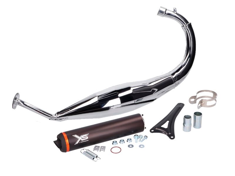 Tecnigas výfuk XS Chrome je úplne nový športový výfuk pre originálne a 50-80cc športové valce. Už v spodnom pásme otáčok má pozoruhodný výkon a vďaka nižšie uvedenému dizajnu obzvlášť športový vzhľad. Chrómovaný povrch optimálne chráni rezonančné telo pred koróziou a zadný tlmič je vyrobený z kvalitného hliníka. Tento výfuk presvedčí v kombinácii s originálnym valcom, ako aj so športovými valcami 50-80cc. Výfuk Tecnigas XS Chrome je tiež absolútnym lákadlom pre oči.Vhodné pre:Peugeot DR01MotorHispania DR01Vhodné aj pre:Beta RR 50 '12-'17 (Euro 3)Beta RR 50 >2016 (Euro 4)Beta'12 RR-50 '17 (Euro 3) Beta Trueba RR 50 >2016 (Euro 4)